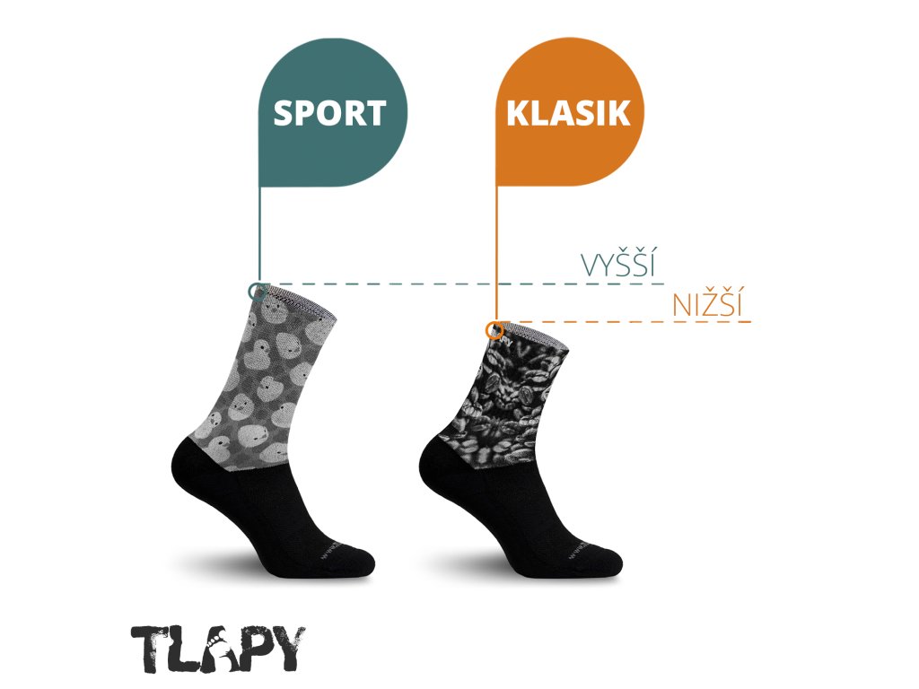 - Typ SPORT je prodloužená ponožka cca do půli lýtek, tedy ještě ne podkolenka ale rozhodně vyšší než je běžné.